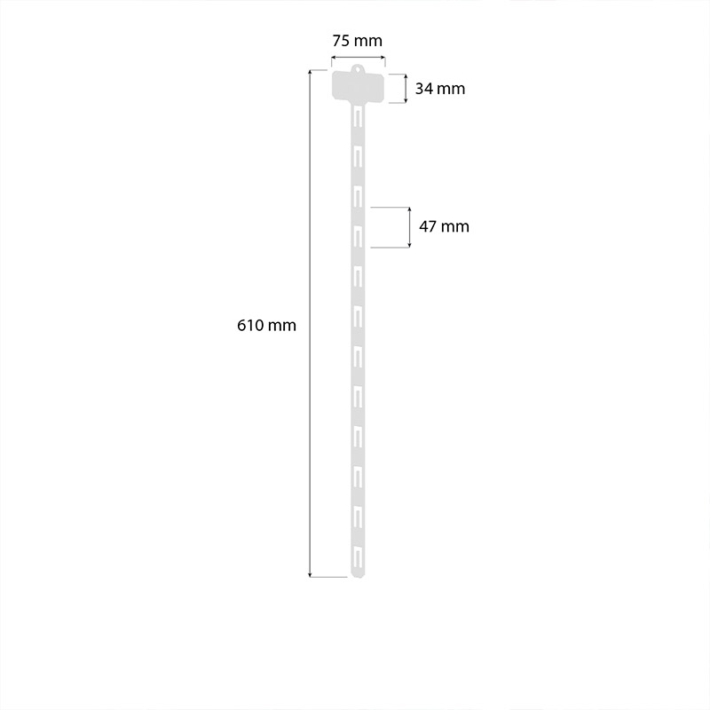Лента подвесная пластиковая полупрозрачная CLIP STRIP-TR-01 254661 изготовлена методом литья под давлением. Является удобным решением для размещения небольших товаров с отверстиями для подвеса. Конструкция повышенной прочности имеет длину 610 мм, оснащена 12 пластиковыми крючками-фиксаторами с шагом 47 мм. Они обеспечивают надежное крепление товара и защиту от падения с ленты. В верхней части страйп-лента имеет отверстие для крепления с использованием специального металлического крючка для страйп-лент или хомута.